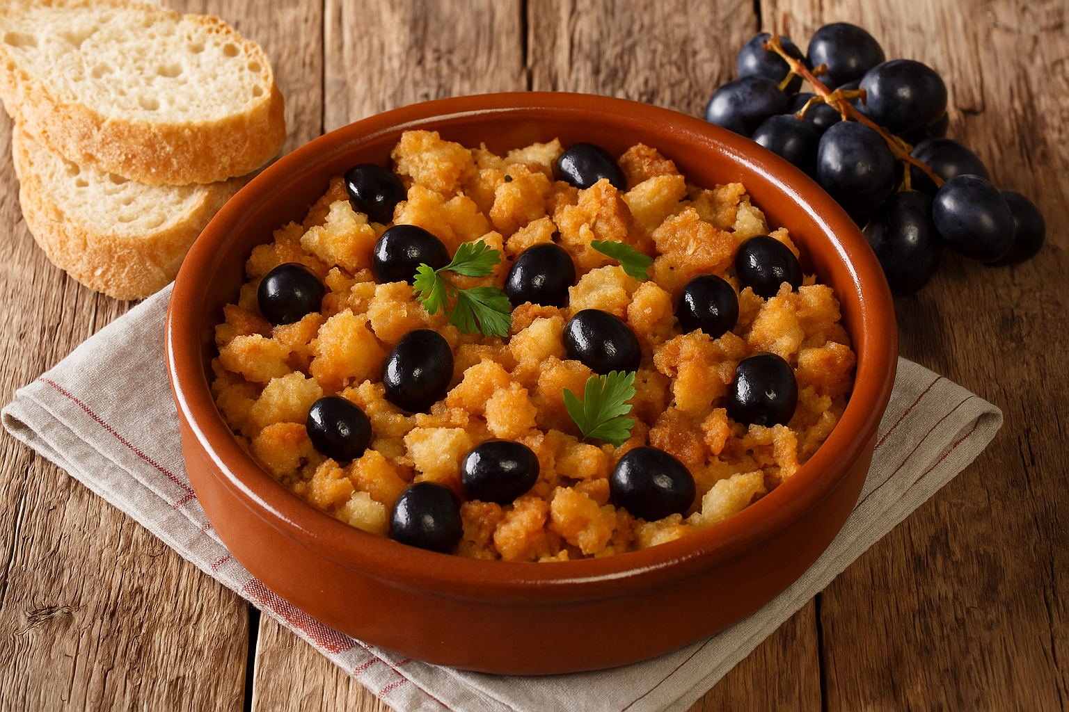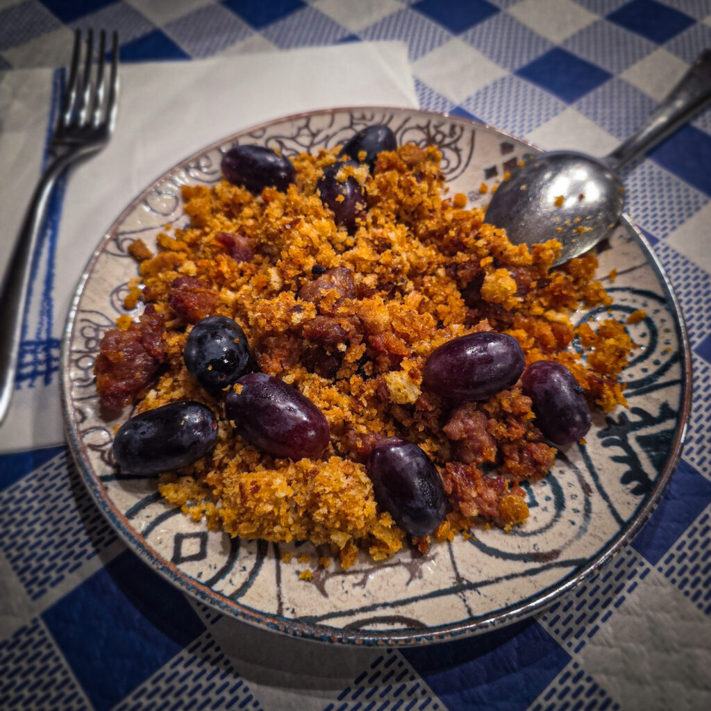 Em Aragão, as Migas ganharam uma identidade própria. Enquanto em outras regiões da Espanha, como a Estremadura ou a Andaluzia, elas podem levar pimentões ou sardinhas, as migas aragonesas são tradicionalmente servidas com “tropezones” (obstáculos, pedaços) de carne de porco: chouriço, linguiça de Aragão (longaniza) e toucinho. E o toque de mestre, o contraponto que eleva o prato a outro patamar, é a adição de uvas no final. A explosão de doçura e frescor da uva corta a riqueza da fritura, criando um equilíbrio de sabores que é, ao mesmo tempo, surpreendente e profundamente reconfortante. É um prato que fala da terra, do ciclo das estações – do porco criado no inverno e da uva colhida no outono.