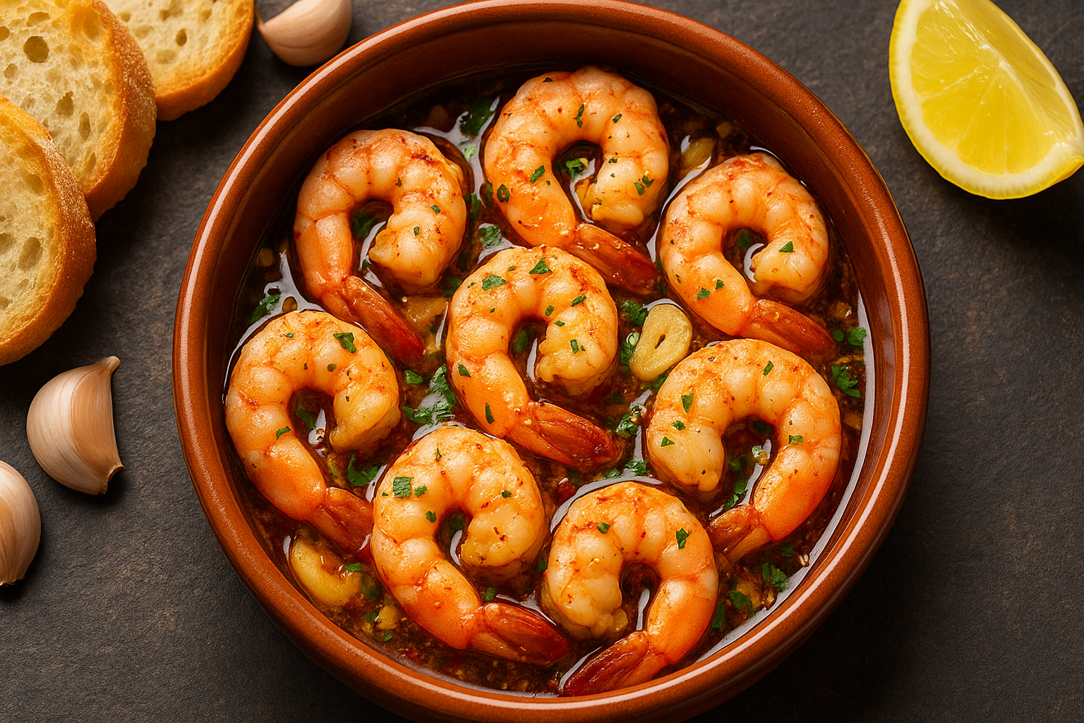 A receita tradicional é a personificação do minimalismo genial: camarões frescos, uma quantidade generosa de alho fatiado, azeite de oliva extravirgem de alta qualidade, um toque de pimenta vermelha (geralmente a guindilla) para um calor sutil e, por vezes, um toque de páprica ou um splash de vinho branco para enriquecer o molho. Tudo isso é cozido rapidamente em uma panelinha de barro chamada cazuela, e o resultado é servido borbulhante, acompanhado de pão fresco para absorver cada gota do azeite aromatizado.
